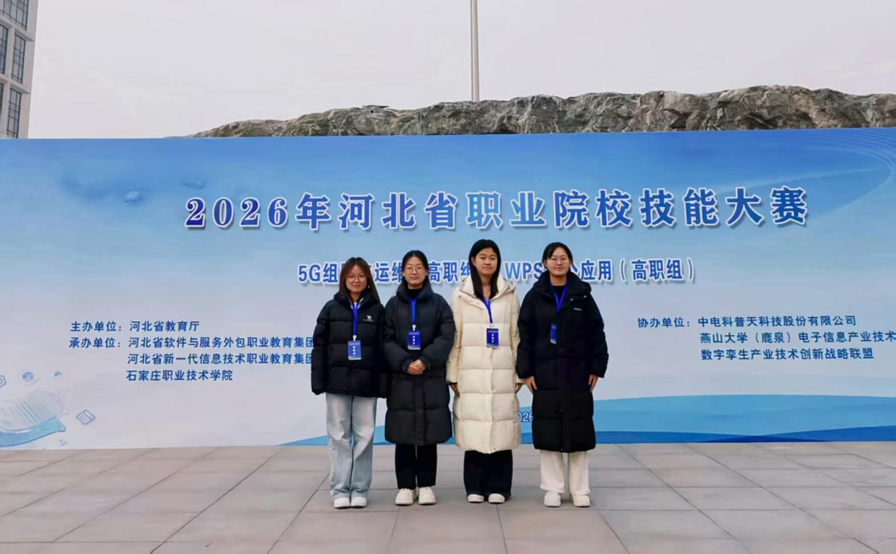 2026年1月5日2026年河北省职业院校技能大赛WPS办公应用(高职组)在石家庄职业技术学院(正定新区新校区)举行。该赛项聚焦高职院校办公软件应用领域的实操能力,重点考察学生在文档排版、数据处理、演示文稿设计等方面的综合素养。我系选派 2 支学生团队参赛,参赛学生来自2024级计算机网络技术2班张晶、2024级虚拟现实技术徐英洁、2024级计算机应用技术2班孔佳鑫、2025级软件技术赵玉霞。比赛过程中,大家沉着应对任务、较好的完成比赛内容。最终,由孔佳鑫、赵玉霞两位同学组成的队伍,在全省100支参赛队伍中荣获本赛项三等奖。该队伍由王颖、沈洪硕两位教师负责指导。